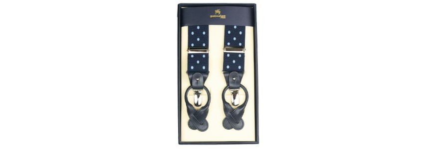 Bretelle con piccoli disegni su fondo blu. Cinturino in nichel Clip in nichel Finale in pelle Larghezza: 3,05 cm Made in Italy
